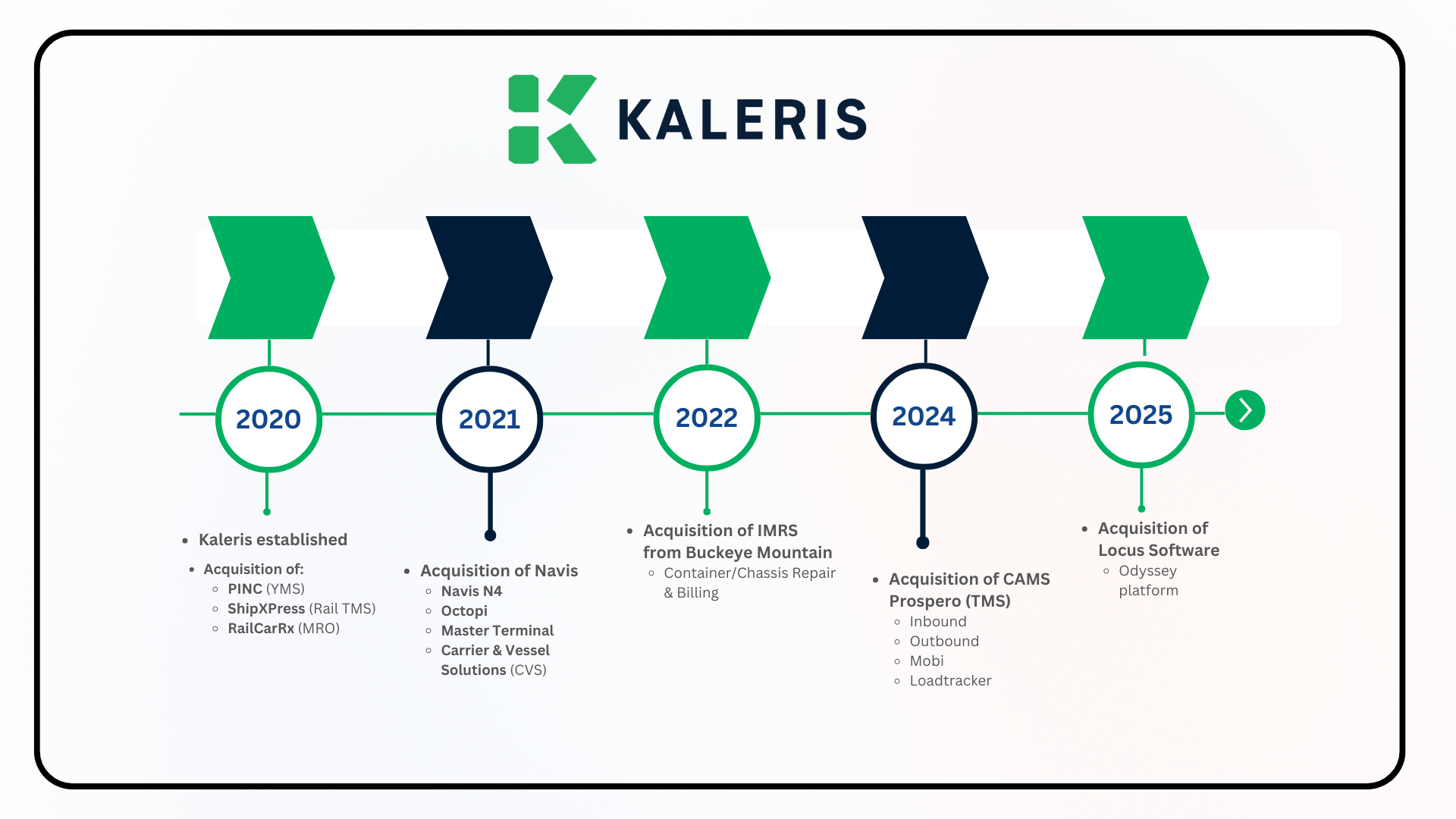 Kaleris was established by bringing together PINC Solutions, ShipXpress, and RailCarRx, which are now Kaleris YMS, TMS, and MRO, respectively. Each solution offers specialized expertise for an essential node or mode in the supply chain. Kaleris continued to build on that foundation, adding Navis solutions for terminal operations and shipping line stowage planning, container/chassis repair from Buckeye Mountain, and inbound/outbounds transport from CAMS Prospero. Most recently, Kaleris acquired Locus software, expanding its carrier management offering for shipping lines.